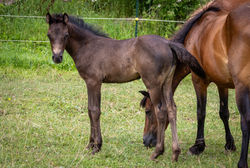 JVF Raven, elegant black filly, is a standout with her keen mind, curious nature, and refined, compact build. She's friendly, alert, and naturally engaged with people. With her smaller stature, balanced conformation, and thoughtful temperament, she shows excellent promise as a future riding partner or broodmare. Her intelligence and willing attitude make her a joy to be around.